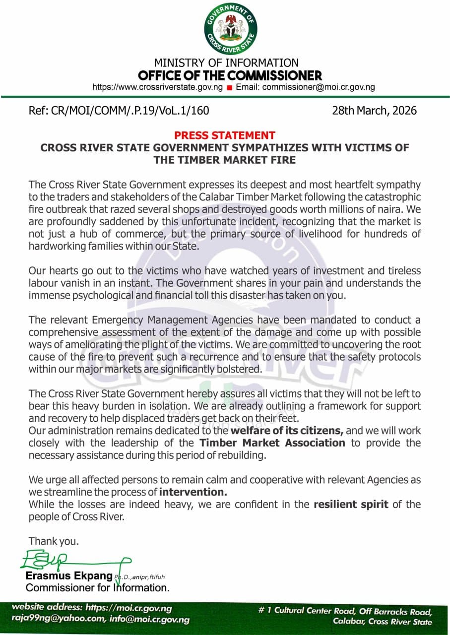Cross River C'River Sympathizes with Timber Market Fire Victims, Pledges Support, Recovery Measures , and Admin March 29, 2026