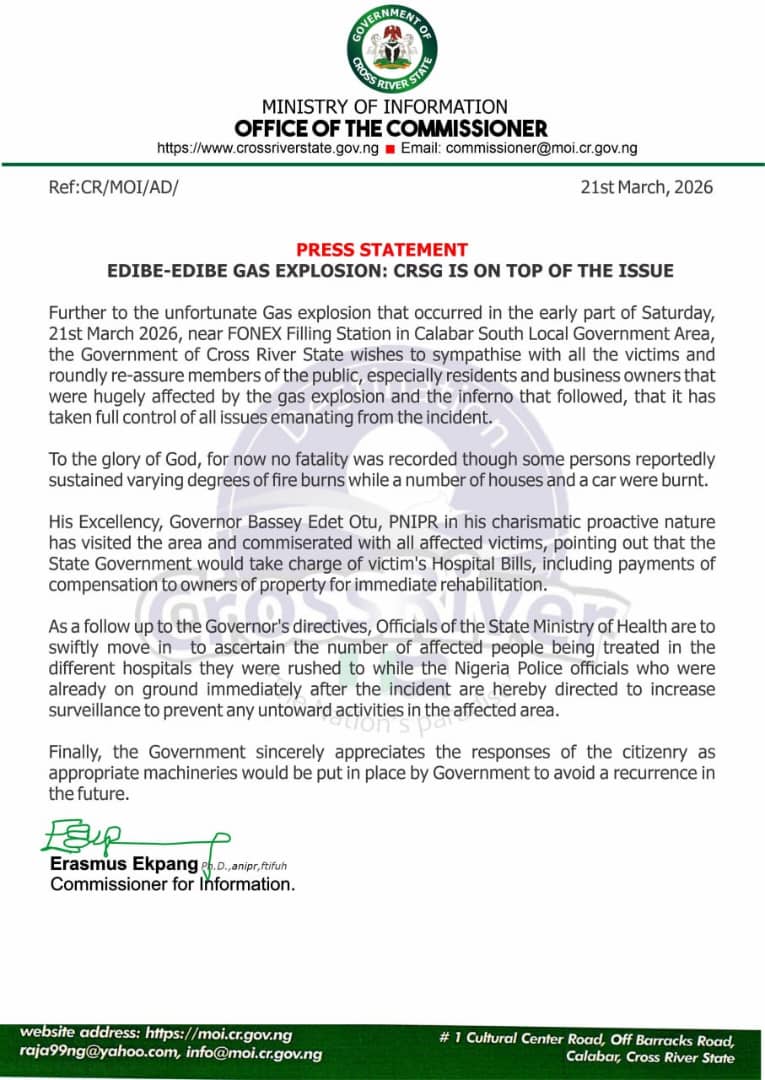 Cross River Gas Explosion: Otu Visits Scene, Orders Free Treatment for Victims , and Admin March 21, 2026